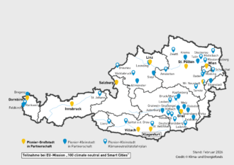 Insgesamt 47 Pionierstädte aus allen österreichischen Bundesländern sind Teil der Mission „Klimaneutrale Stadt“ und setzen auf Forschung und Innovation, um das gemeinsame Ziel – die Klimaneutralität – noch schneller zu erreichen. Diese Städte repräsentieren etwa 40% der österreichischen Bevölkerung.