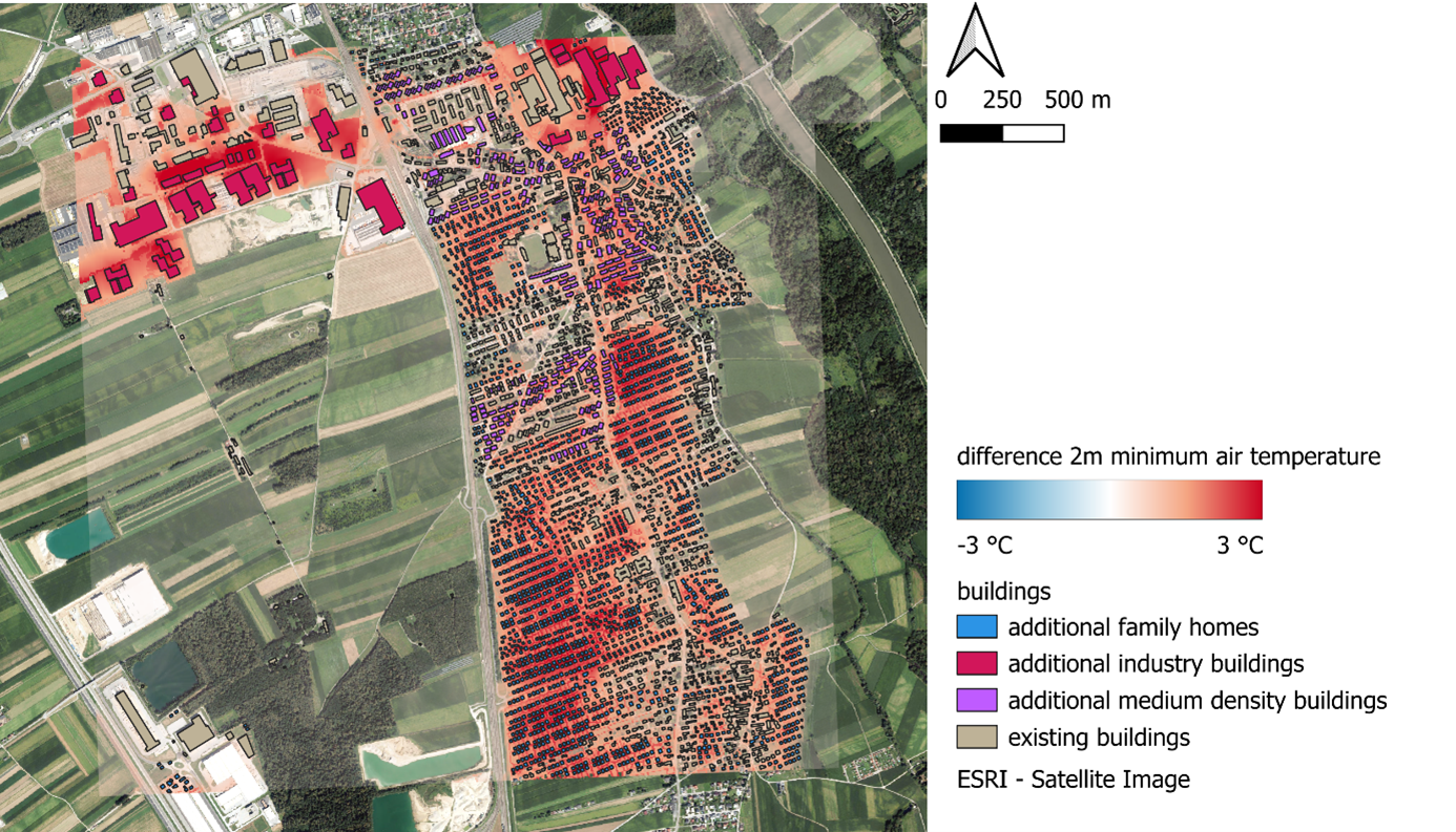 Erste Modellergebnisse des Forschungsprojekts zeigen, dass es während Hitzewellen bei weiterer unkontrollierter Versiegelung in den Umlandgemeinden von Graz zu einer zusätzlichen lokalen Erwärmung von cs. 2 °C in der Nacht kommen wird (siehe Abb. 1).